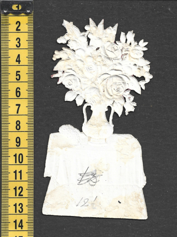 Bloemenvaas op tafel antiek poezieplaatje met zijde (748)