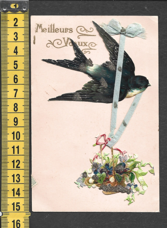 Zwaluw zweeft met Bloemen - Frans - poezieplaatjes antieke kaart (308)Zie foto's, beschreven.